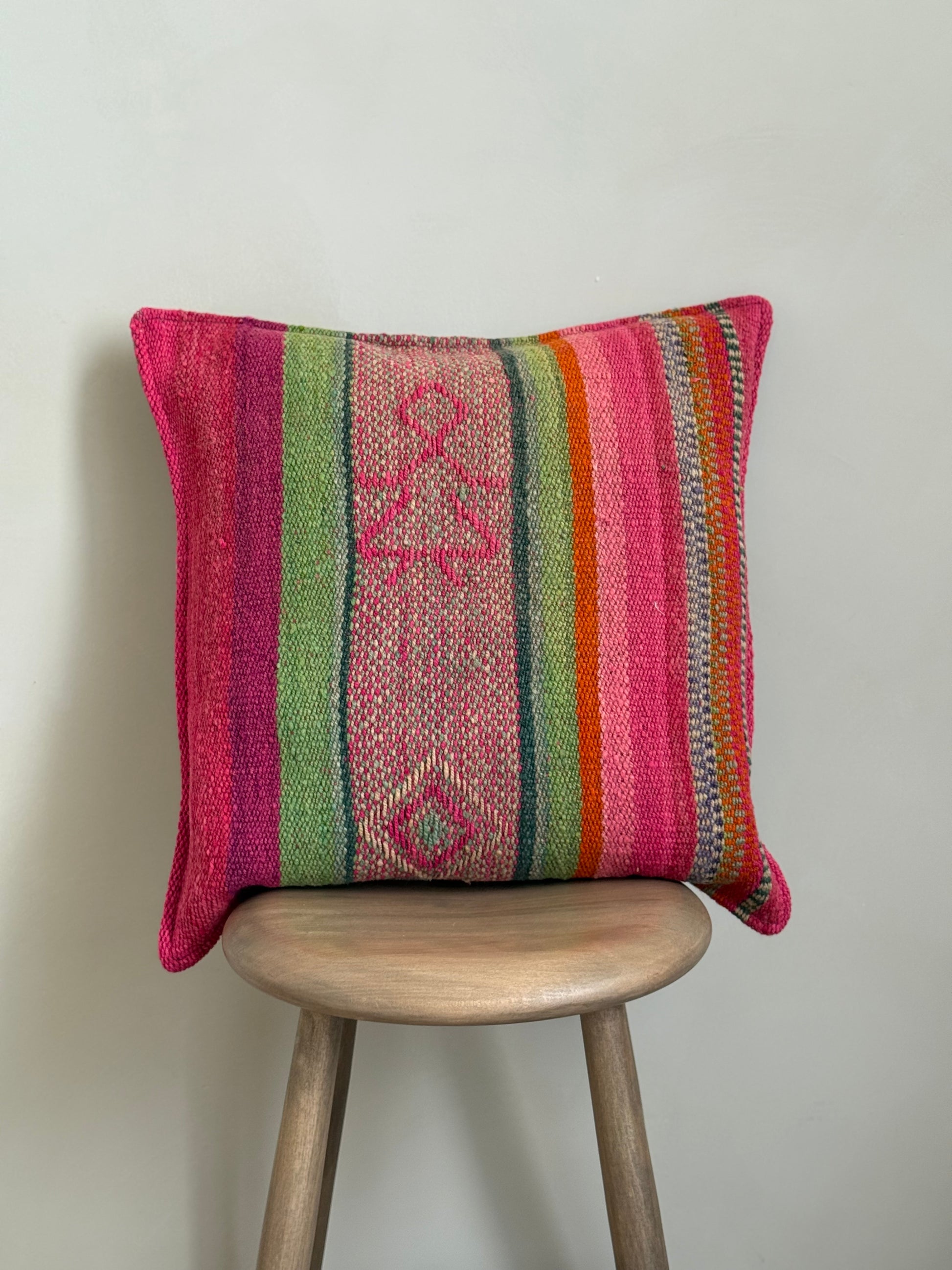 Onze kussenhoezen zijn gemaakt van unieke, handgeweven Andesdekens van schapenwol, meer dan 80 jaar oud. Elke deken vertelt een verhaal via kleur en patroon en wordt verkregen via het traditionele ruilsysteem Ayni. Van elke deken maken we slechts enkele hoezen.