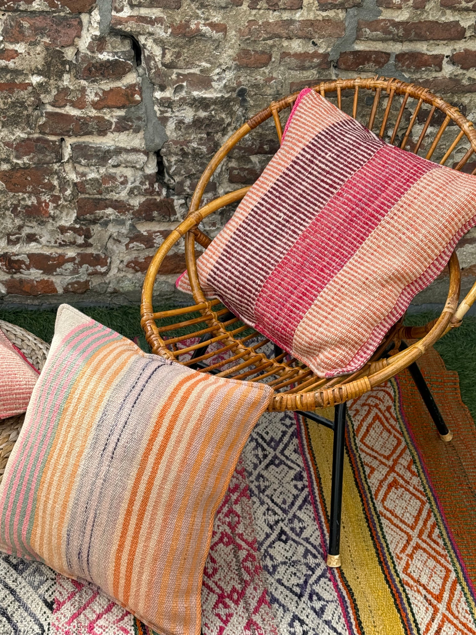 Onze kussenhoezen zijn gemaakt van unieke, handgeweven Andesdekens van schapenwol, meer dan 80 jaar oud. Elke deken vertelt een verhaal via kleur en patroon en wordt verkregen via het traditionele ruilsysteem Ayni. Van elke deken maken we slechts enkele hoezen.