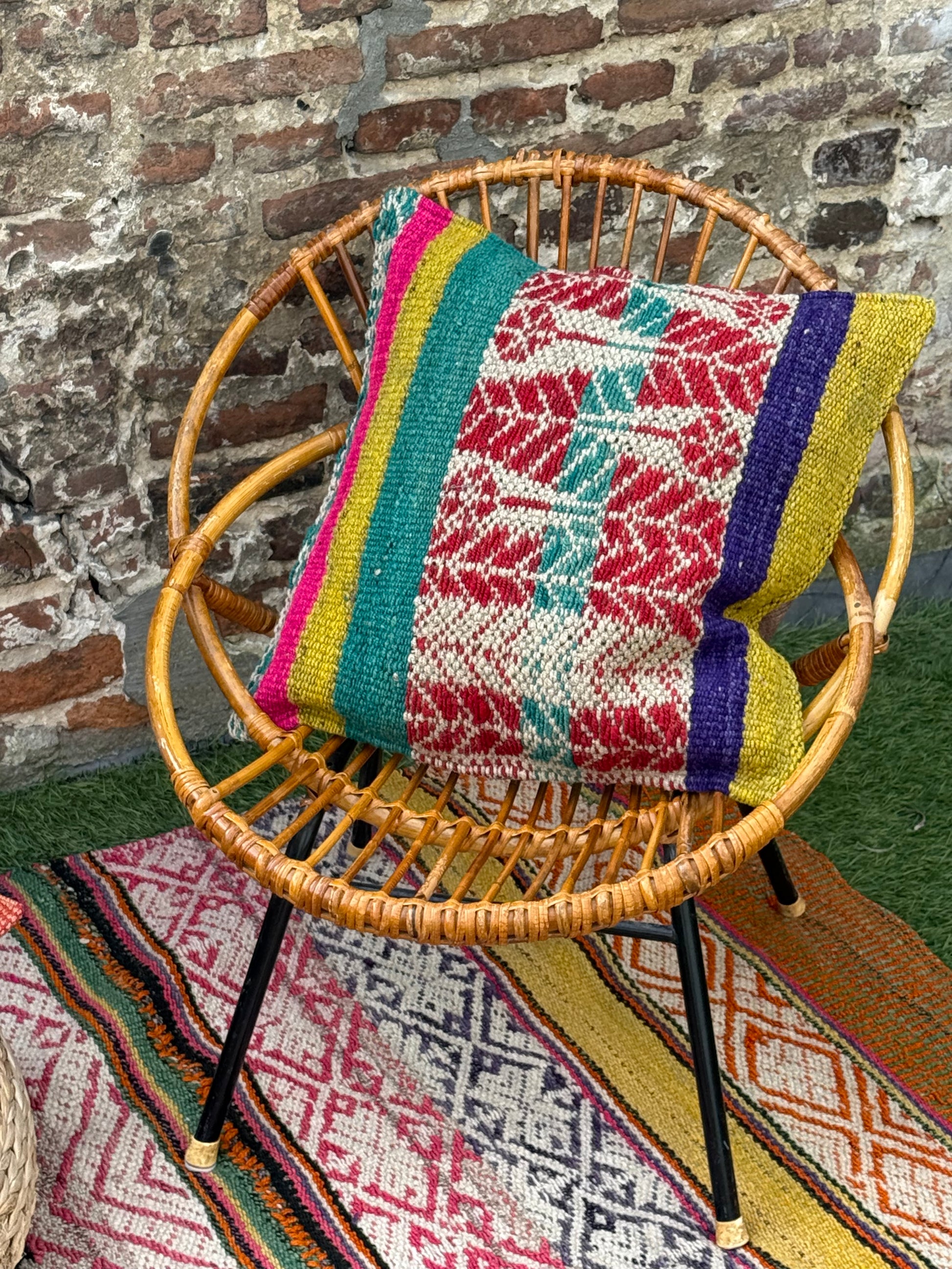 Onze kussenhoezen zijn gemaakt van unieke, handgeweven Andesdekens van schapenwol, meer dan 80 jaar oud. Elke deken vertelt een verhaal via kleur en patroon en wordt verkregen via het traditionele ruilsysteem Ayni. Van elke deken maken we slechts enkele hoezen.