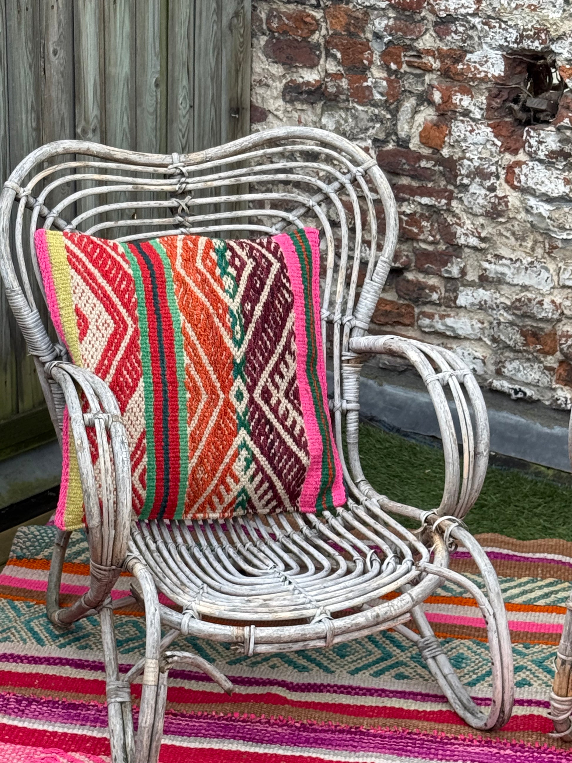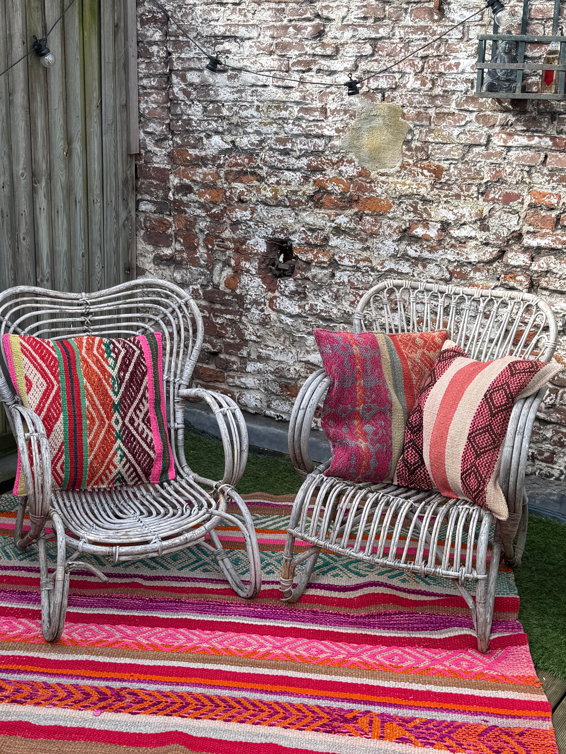 Onze kussenhoezen zijn gemaakt van unieke, handgeweven Andesdekens van schapenwol, meer dan 80 jaar oud. Elke deken vertelt een verhaal via kleur en patroon en wordt verkregen via het traditionele ruilsysteem Ayni. Van elke deken maken we slechts enkele hoezen.