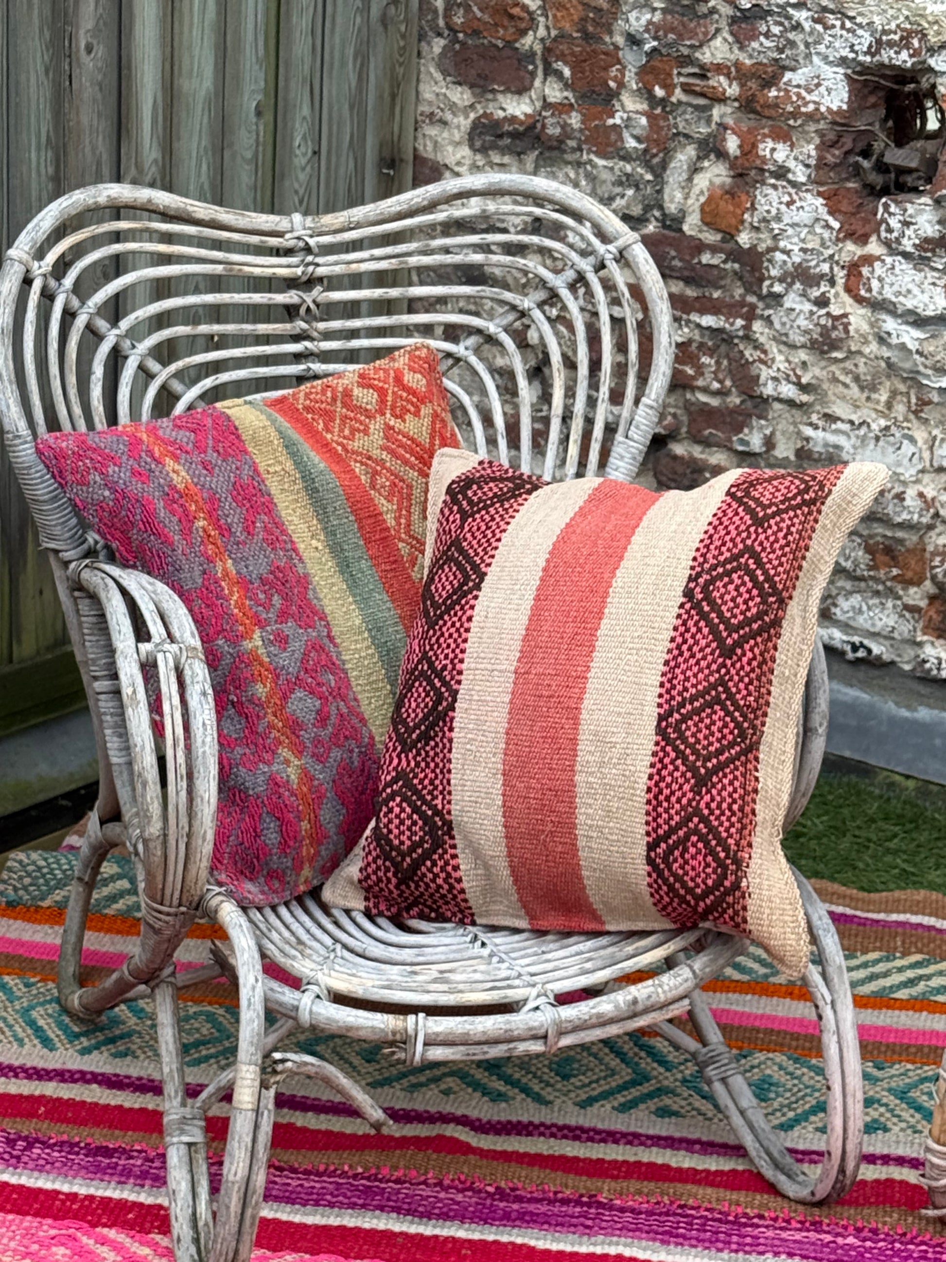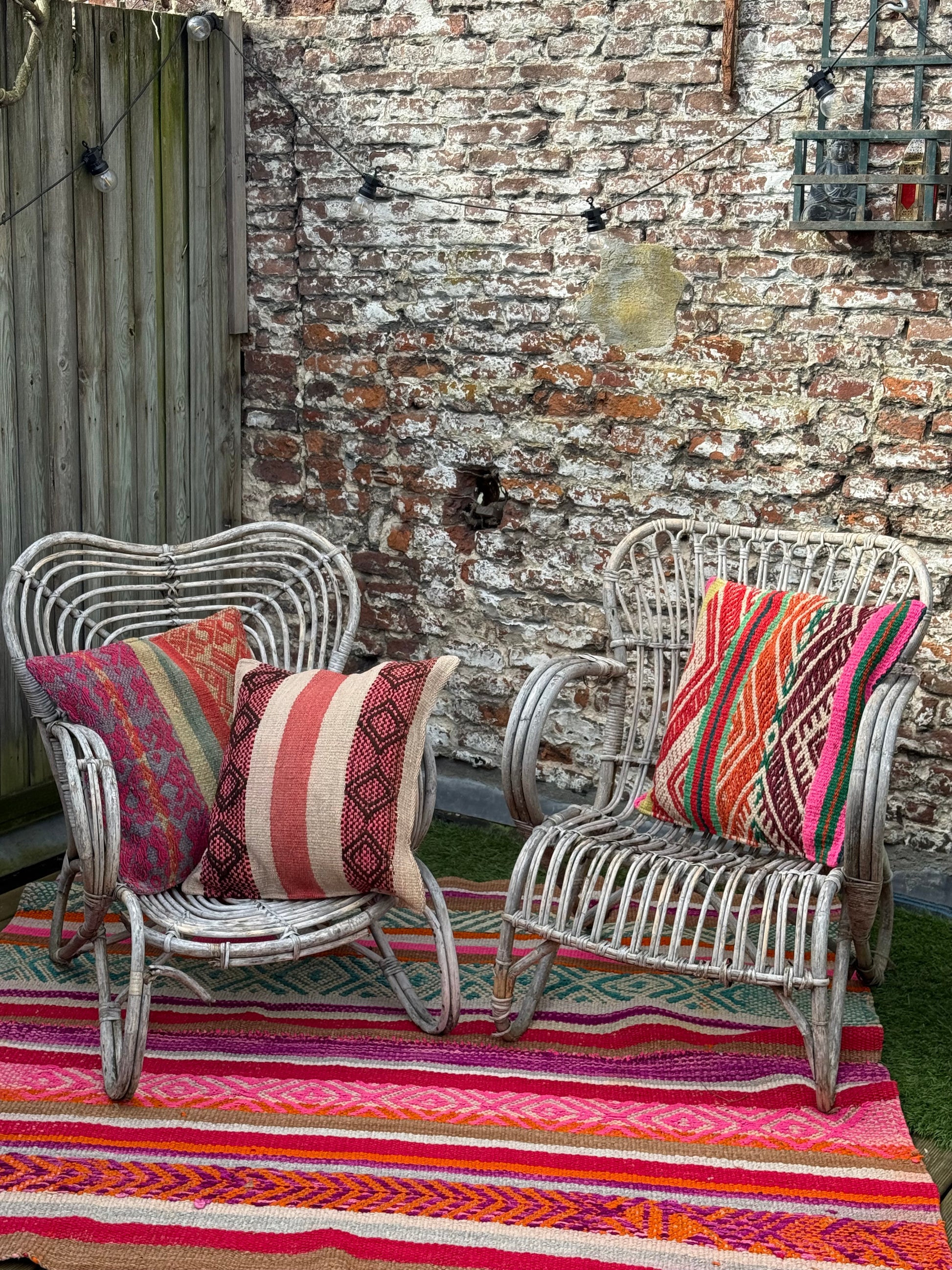 Onze kussenhoezen zijn gemaakt van unieke, handgeweven Andesdekens van schapenwol, meer dan 80 jaar oud. Elke deken vertelt een verhaal via kleur en patroon en wordt verkregen via het traditionele ruilsysteem Ayni. Van elke deken maken we slechts enkele hoezen.