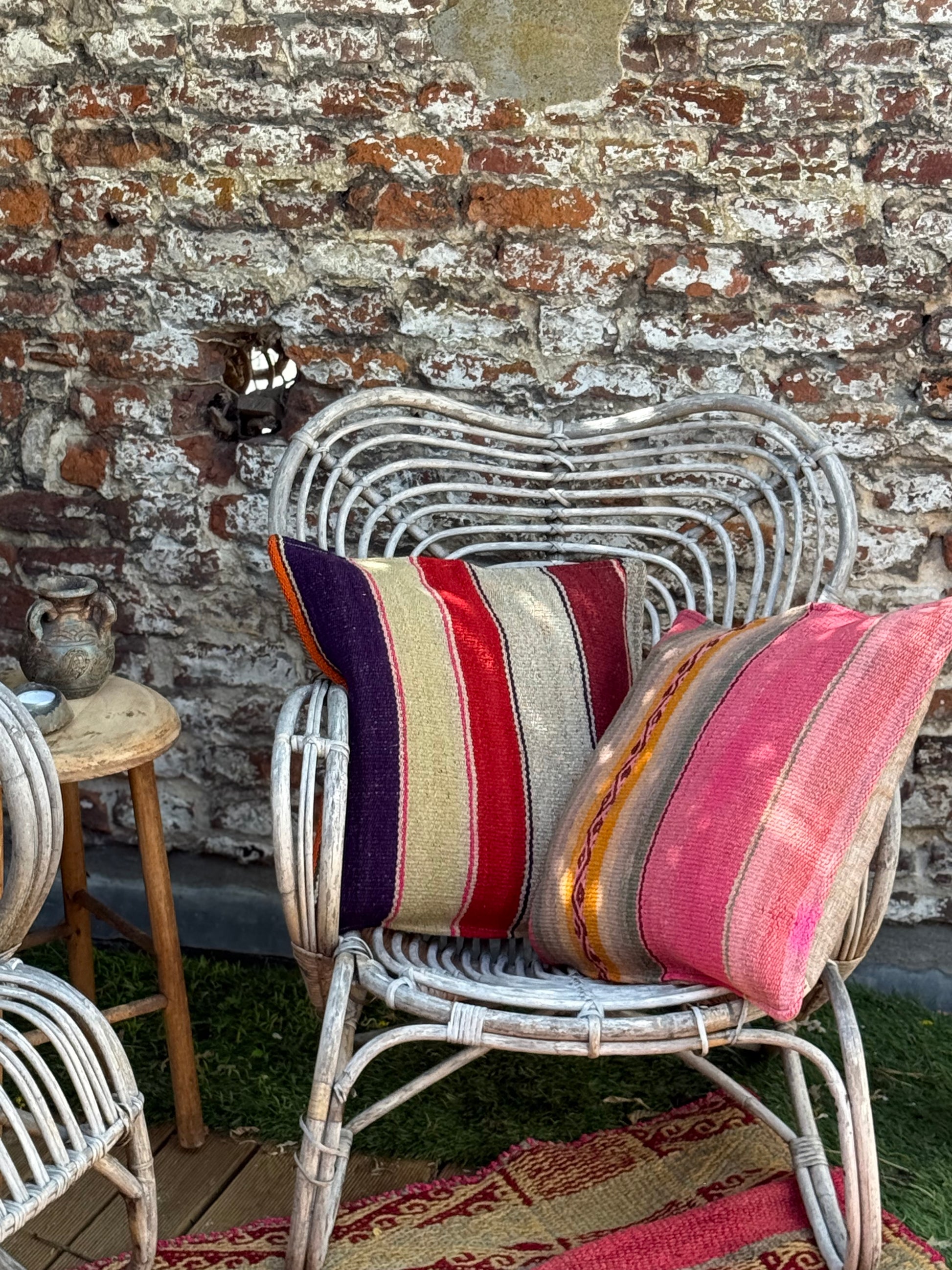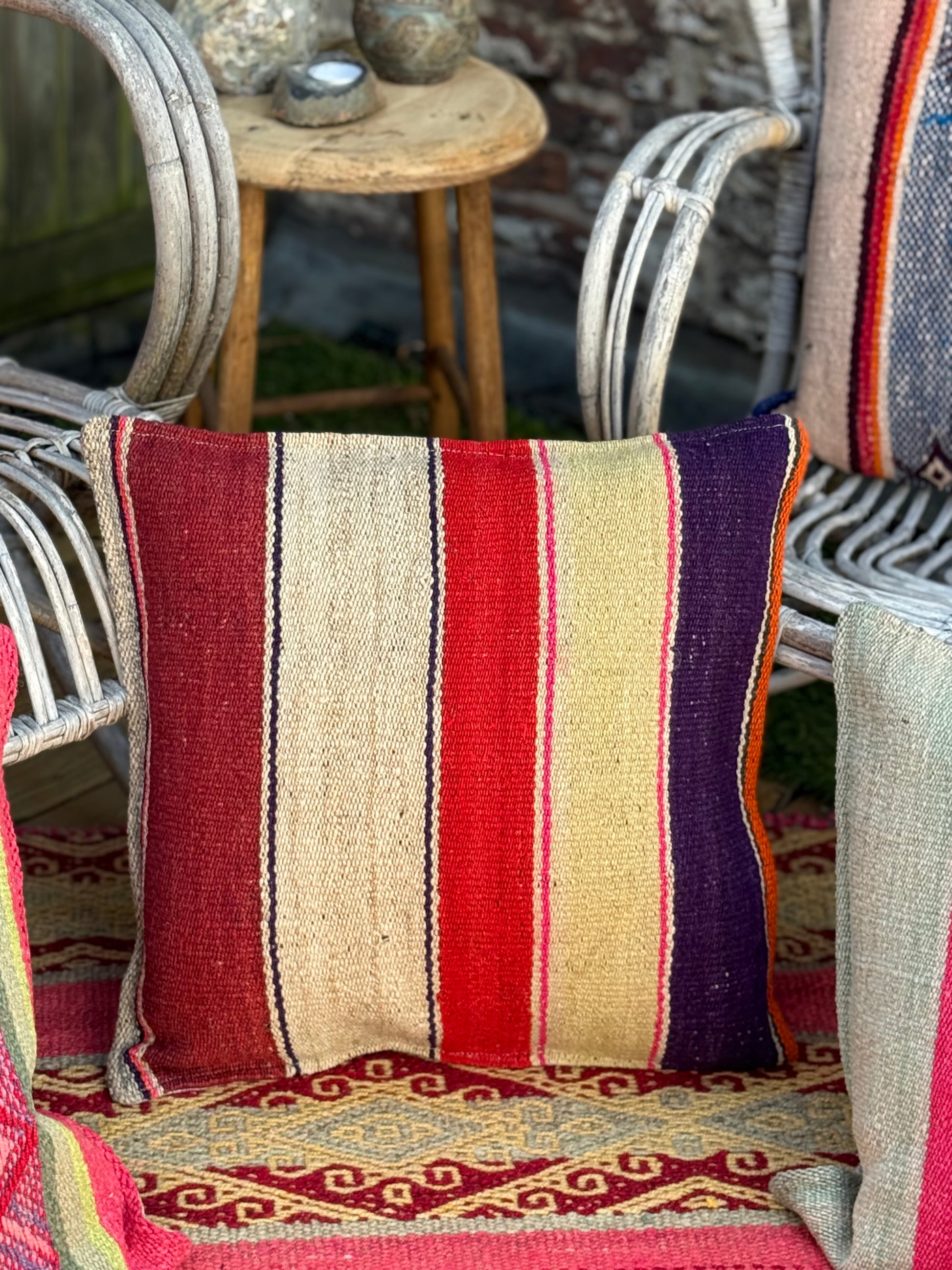 Onze kussenhoezen zijn gemaakt van unieke, handgeweven Andesdekens van schapenwol, meer dan 80 jaar oud. Elke deken vertelt een verhaal via kleur en patroon en wordt verkregen via het traditionele ruilsysteem Ayni. Van elke deken maken we slechts enkele hoezen.