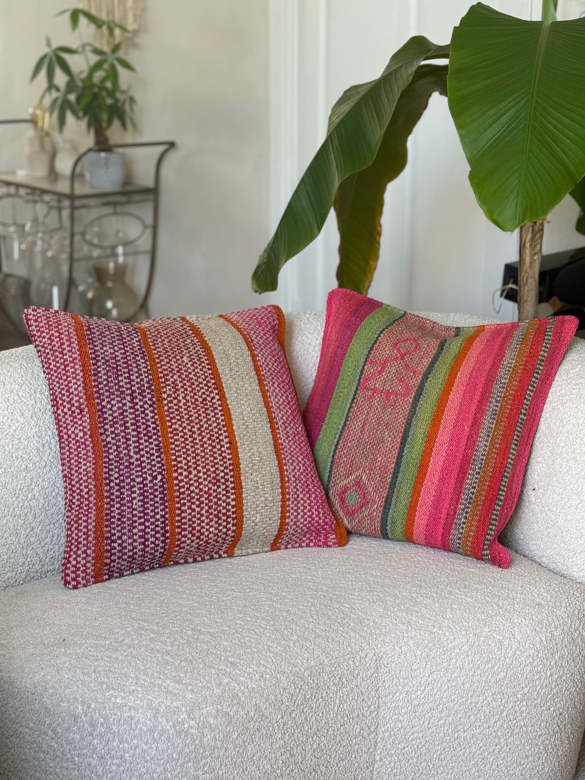 Onze kussenhoezen zijn gemaakt van unieke, handgeweven Andesdekens van schapenwol, meer dan 80 jaar oud. Elke deken vertelt een verhaal via kleur en patroon en wordt verkregen via het traditionele ruilsysteem Ayni. Van elke deken maken we slechts enkele hoezen.