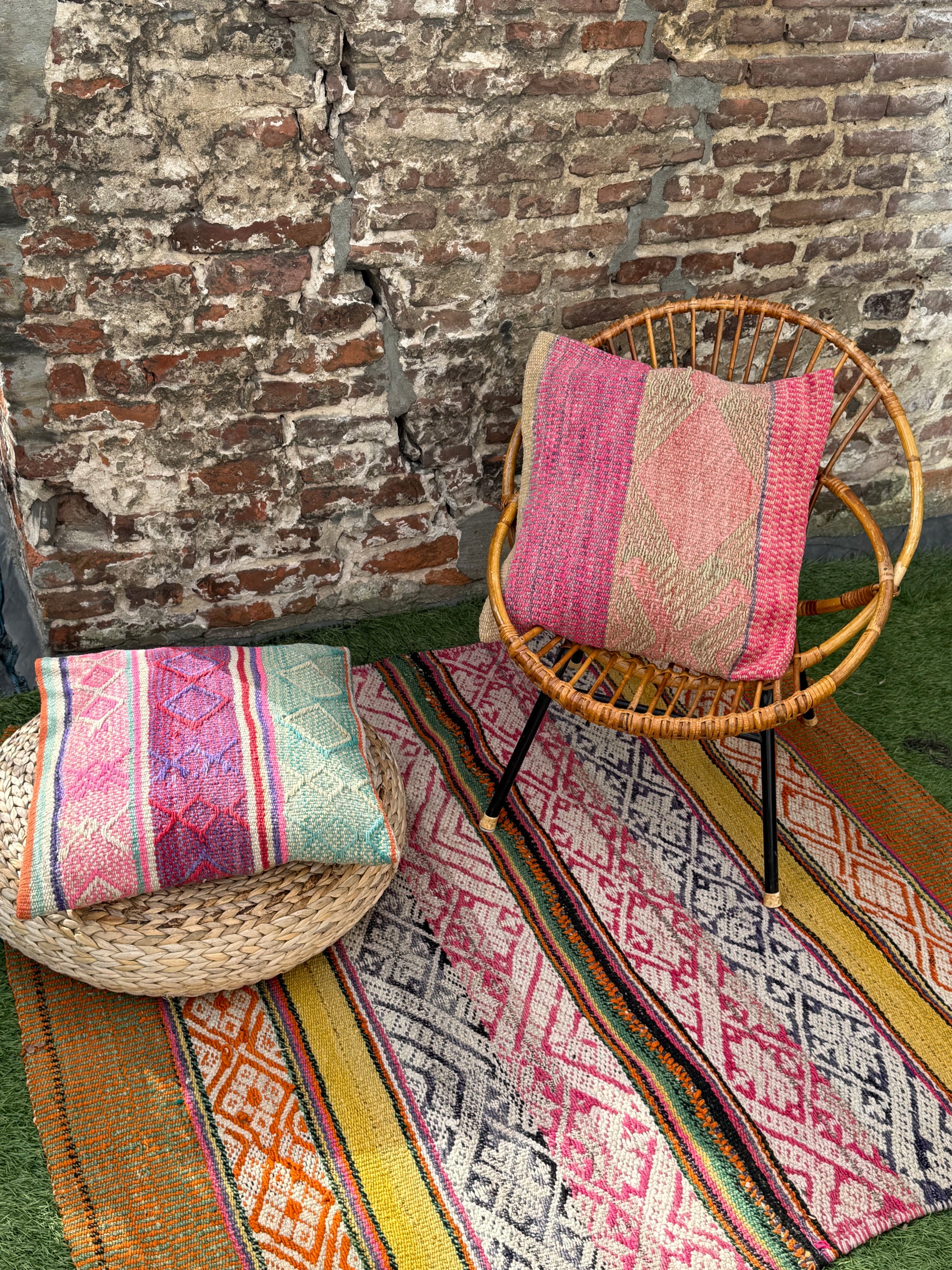 Onze kussenhoezen zijn gemaakt van unieke, handgeweven Andesdekens van schapenwol, meer dan 80 jaar oud. Elke deken vertelt een verhaal via kleur en patroon en wordt verkregen via het traditionele ruilsysteem Ayni. Van elke deken maken we slechts enkele hoezen.